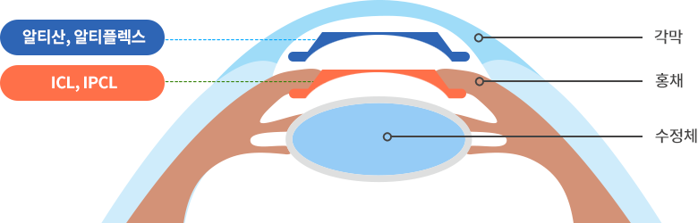 안내렌즈 삽입술이란 각막이 너무 얇거나 각막 모양의 고르지 못한 경우 등 각막에 손상이 부담스러우신 특수 고안된 렌즈를 경우 각막과 수정체의 손상 거의 없이 각막과 홍채 사이 또는 홍채와 수정체 사이에 렌즈를 삽입하여 시력을 교정할 수 있는 수술입니다.